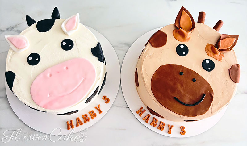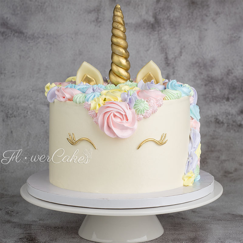 Enhörningstårta till barnkalaset. Dekorerad med ätbara horn & öron av sockerpasta.
