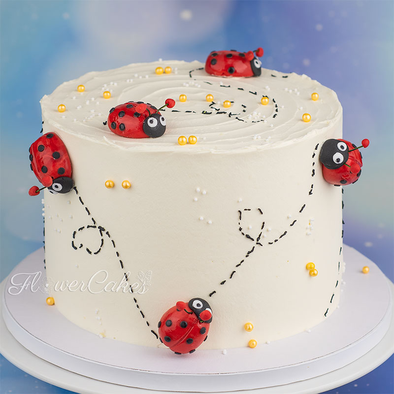 Barntårta dekorerad med roliga nyckelpigor av sockerpasta.