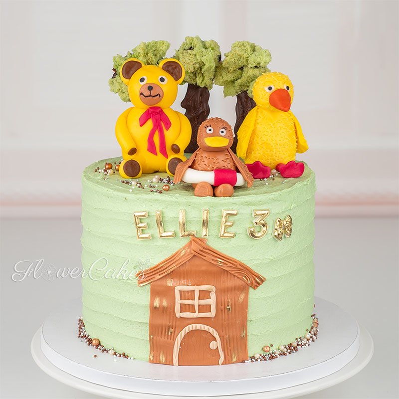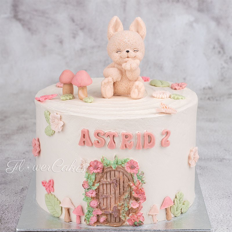 Barntårta dekorerad med dörr, blommor, löv svampar, fjärilar och en hare på toppen :)