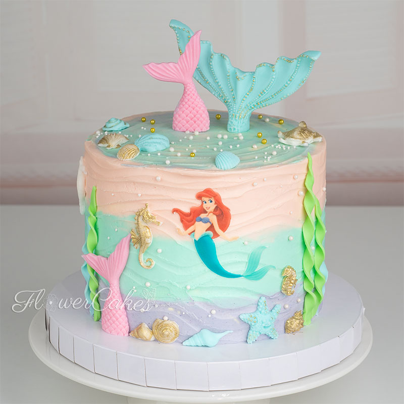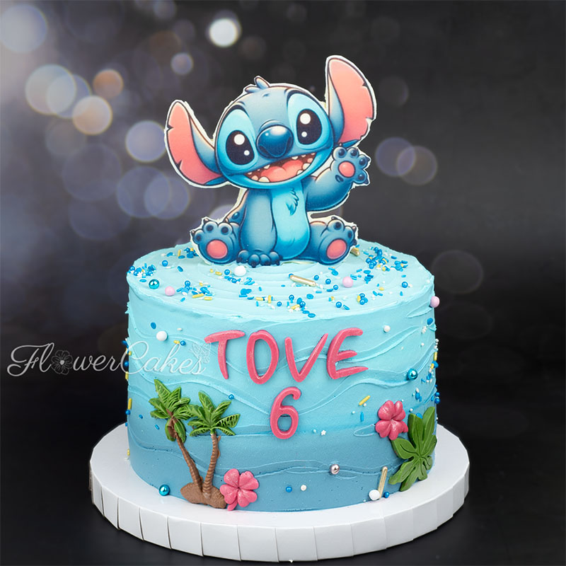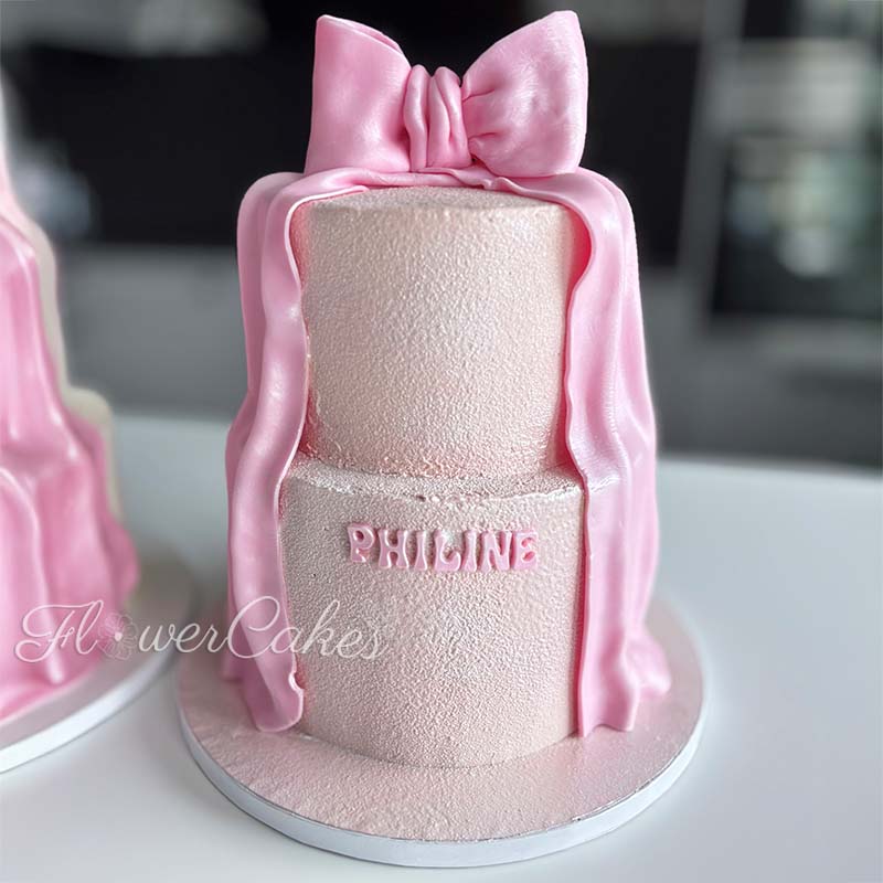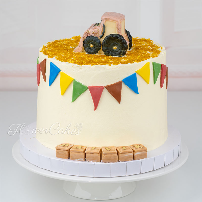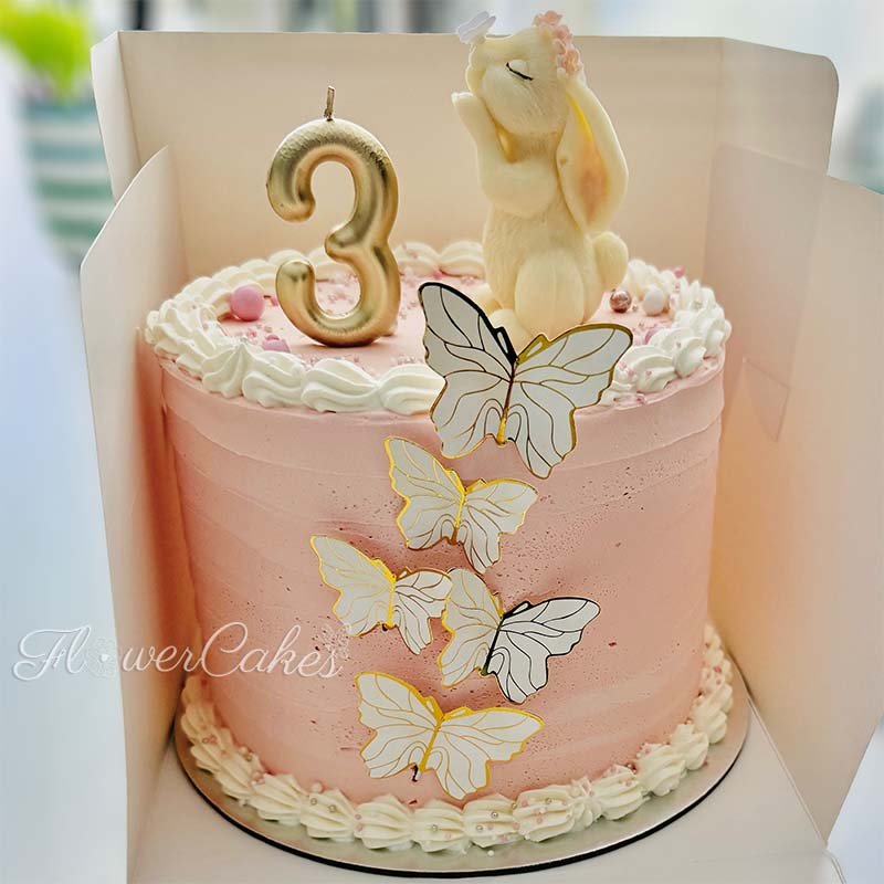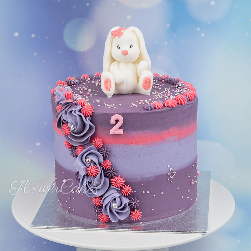 Tårta till en 2-åring, dekorerad med snygg spritsning och en hare på toppen.