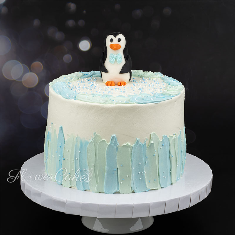 Tårta dekorerad med en liten pingvinfigur på toppen.