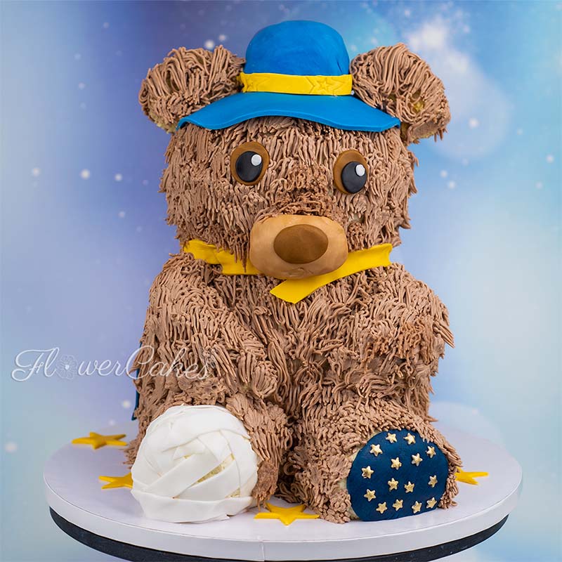 Tårta i form av en sittande nallebjörn med hatt och mantel.