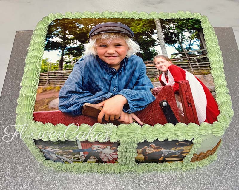 Tårta dekorerad med bilder av Emil i Lönneberga.