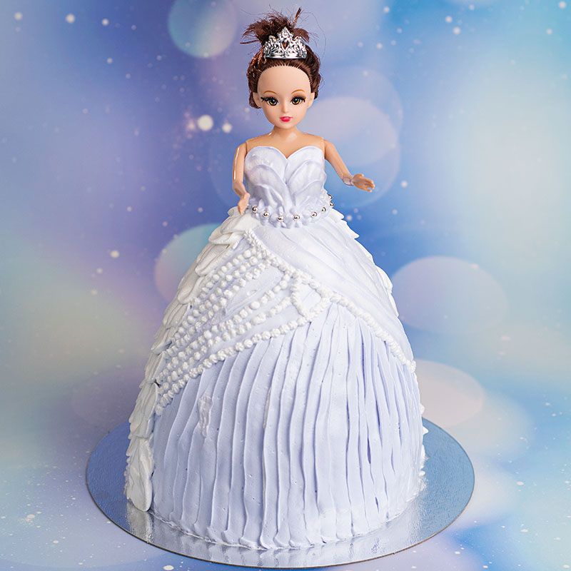Tårta i form av en Barbiedocka (brunett) med lång, fin klänning och en liten tiara. Ca 20 cm hög utan dockan, 18 cm diameter i botten.