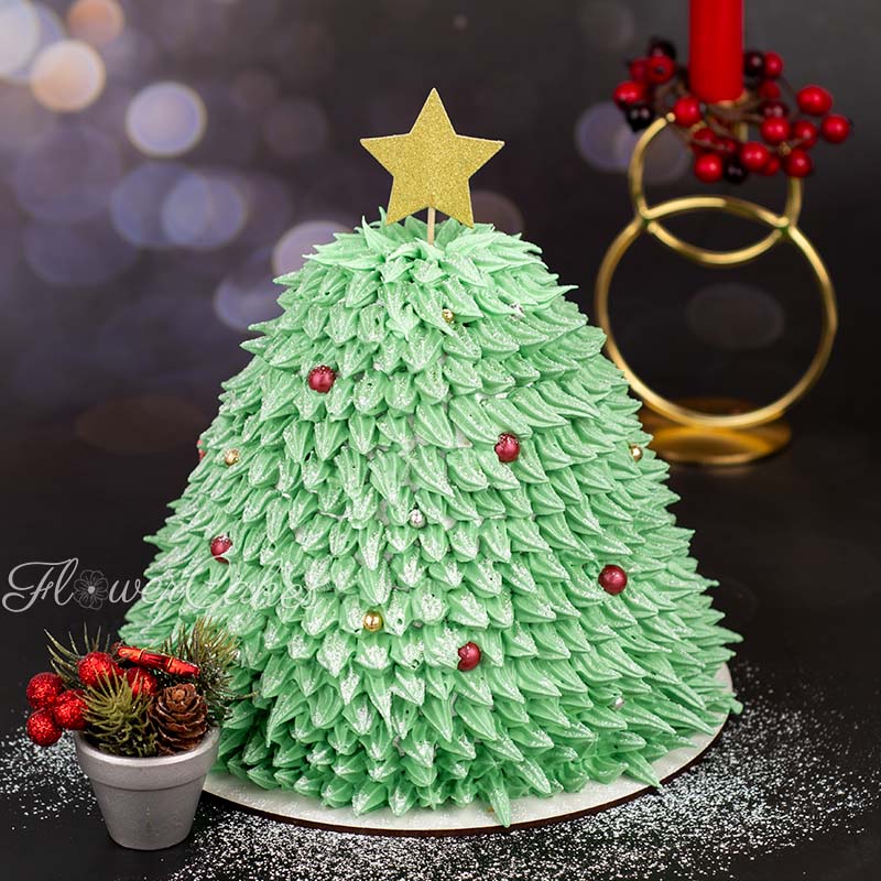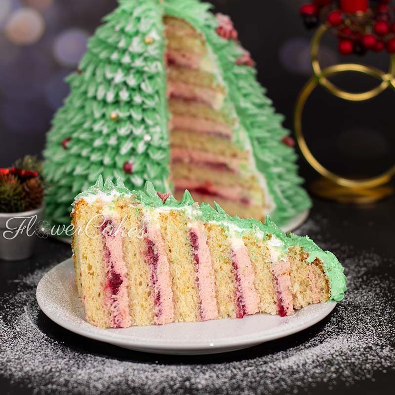Julgranstårta med vaniljbottnar och chokladganache kräm med hallon smak och hallon gele´.