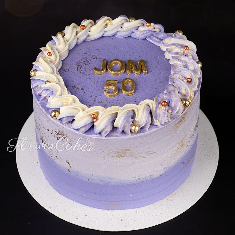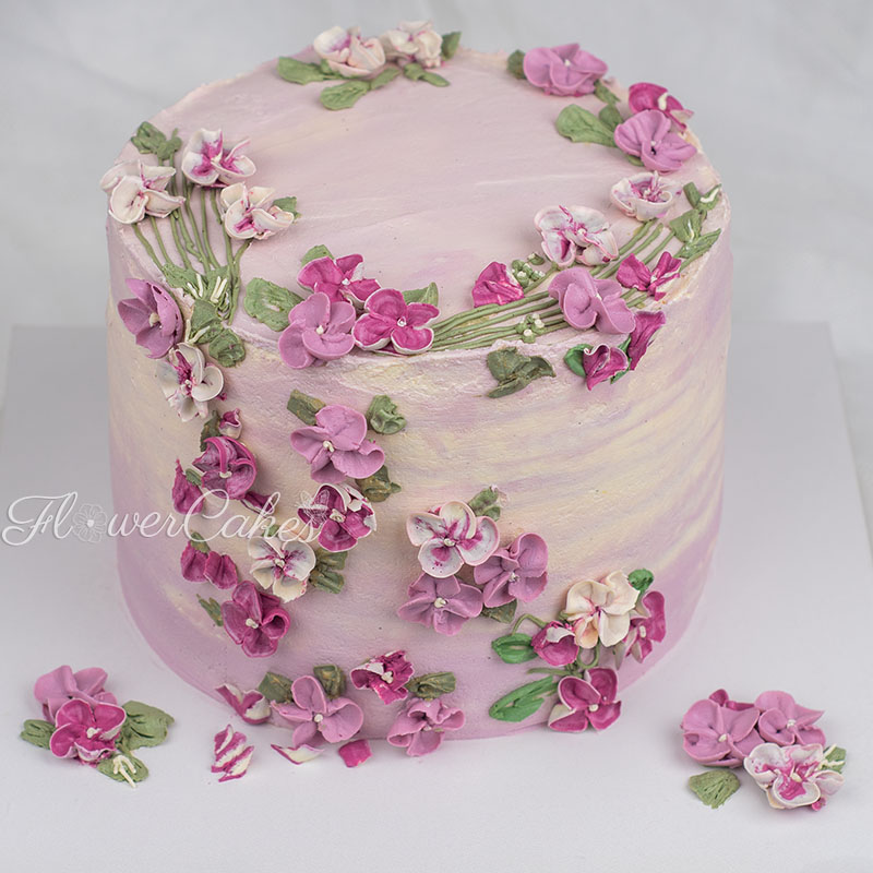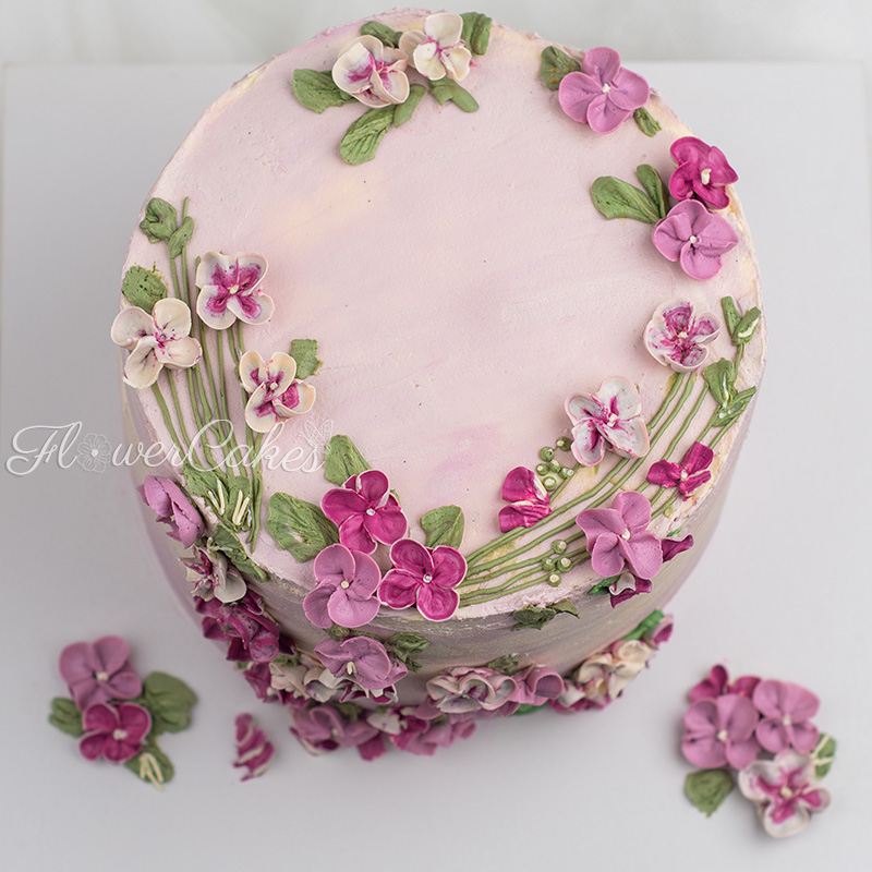 Blåbär/Citrontårta dekorerad med blommor i lila & rosa färger.