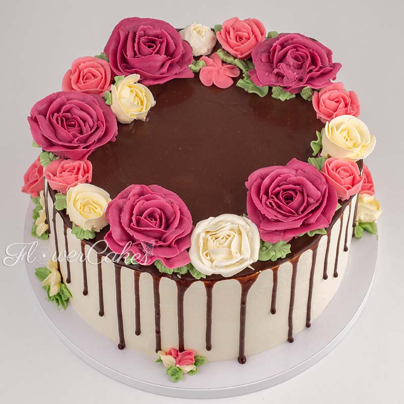Honungstårta (Medovik) dekorerad med rosor av smörkräm och chokladdrip.