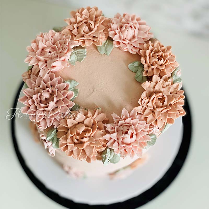 Tårta dekorerad med blommor av bean paste i form av chrysantemum.