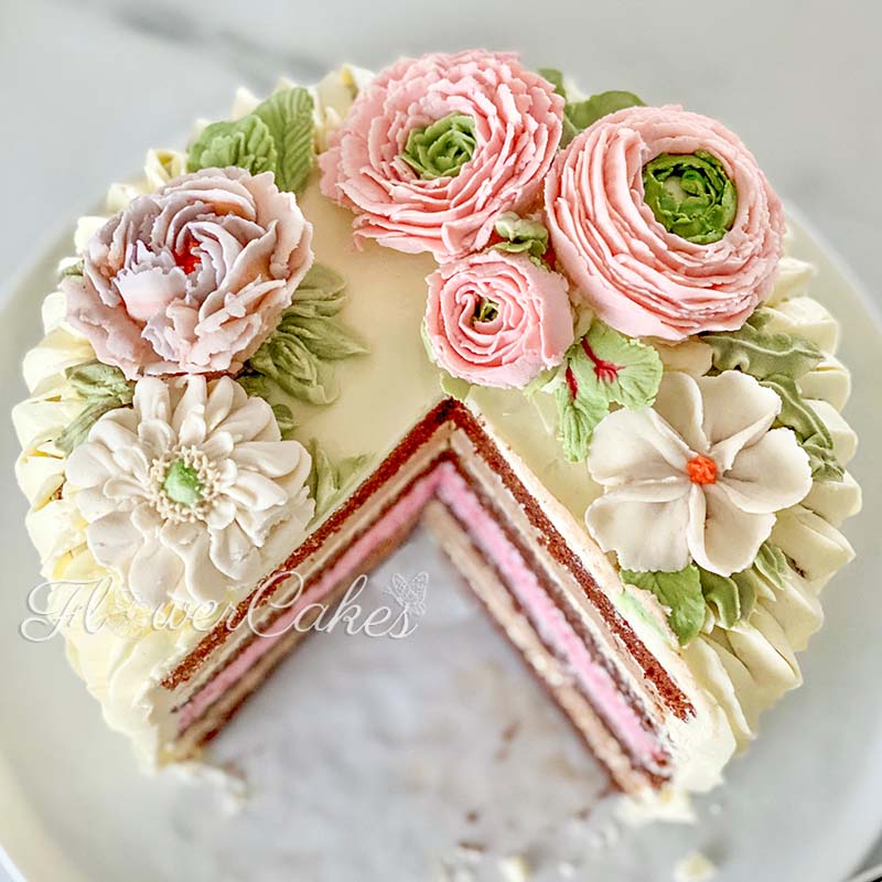 Choklad/hallondröm dekorerad med ranunkler av bean paste.
