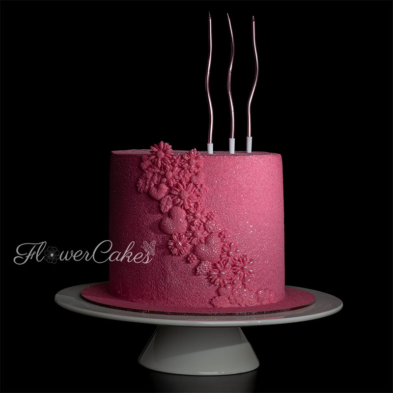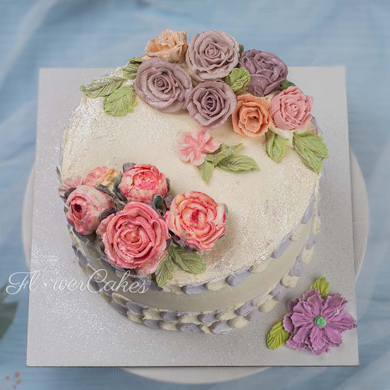 Tårta dekorerad med spritsade rosor i olika färger, med glitter.