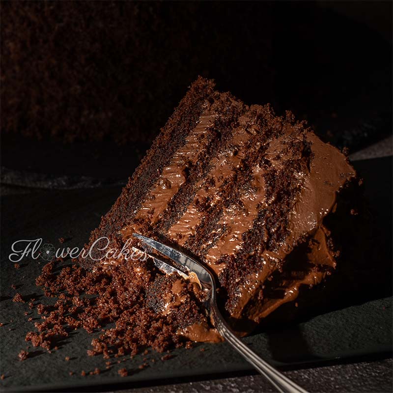 Chokladtårta - chokladbottnar med härlig chokladkräm som smälter i munnen - här en skuren bit.