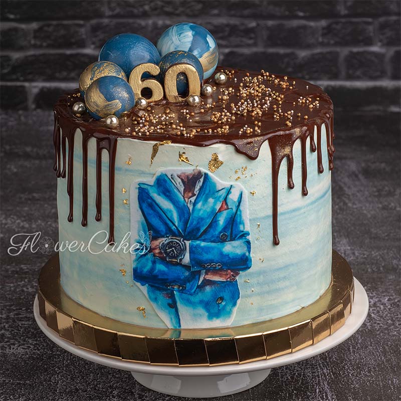 60-års tårta, dekorerad med tårtbild, bollar samt siffror av choklad.