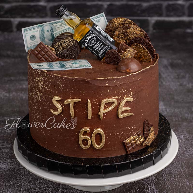 60-års tårta, manligt dekorerad med en Jack Daniel's-flaska, kex och dollarsedlar.