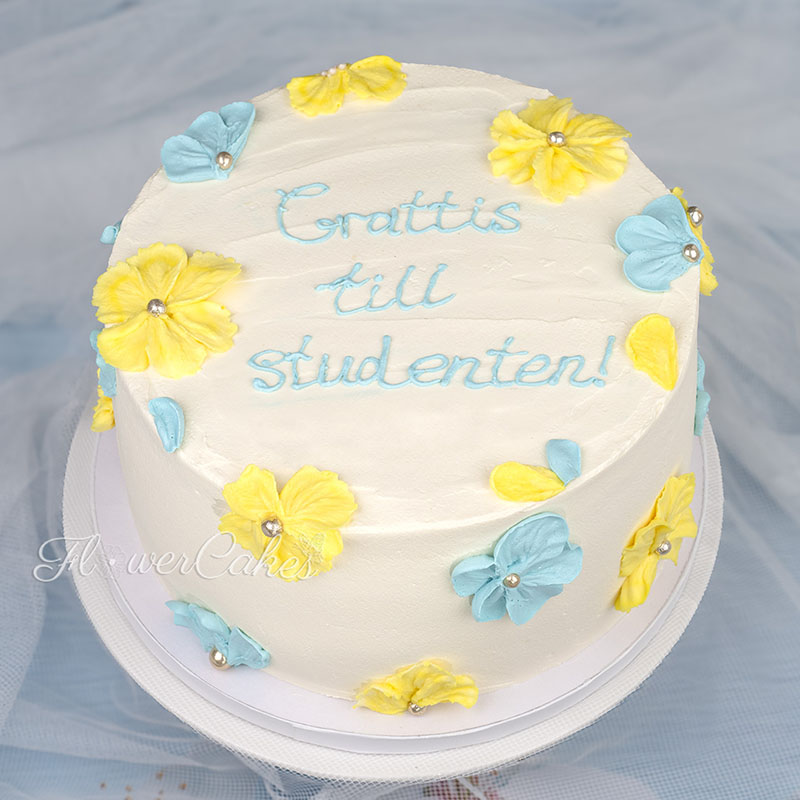 Studenttårta med lite enklare blommor och text.